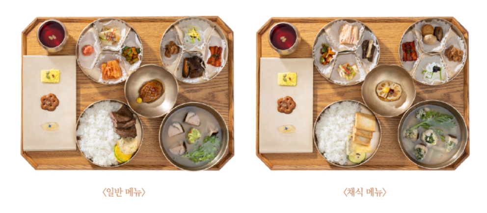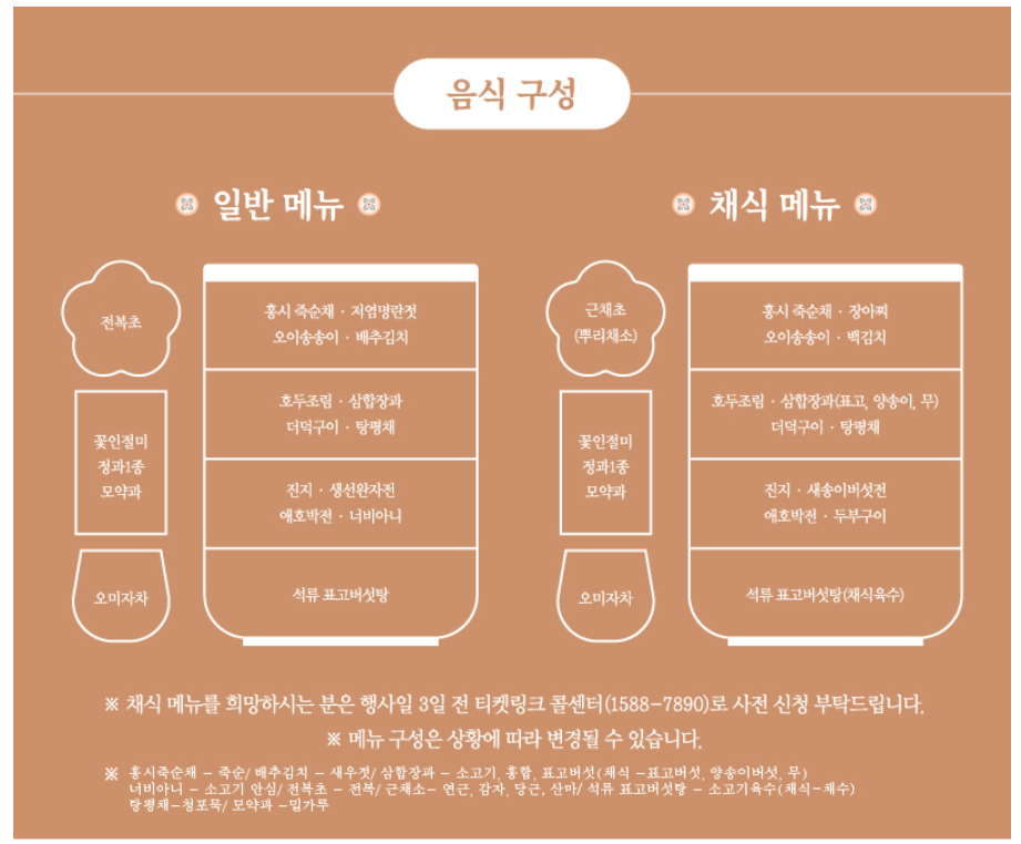 ※ 일반 사람들을 위하여 일반메뉴와 채식만을 하는 채식가들을 위한 메뉴로 나뉘어 집니다. 채식 메뉴를 희망하는 분은 행사 3일 전 티켓링크 콜센터 (1588-7890)에 사전 신청을 해야 합니다.